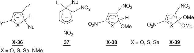 The effectiveness of SNAr reactions at the α-position implies the formation of hetarenide intermediates such as X-36, where Y and Z denote EWG groups (e.g., NO2, CN, CHO, CO2R) [103]. Compared to the benzene systems, the lower aromaticity of the five-membered rings and the ability of heteroatoms such as O, S, and Se to accommodate the negative charge are two factors that favor the formation of X-36 [4, 6, 9]. Another favorable factor is that the attainment of the tetrahedral geometry at the reaction site in a σ-adduct involves much less bond strain in five-membered than in six-membered rings [6, 9, 13b, 104] In agreement with these views, theoretical calculations suggest a much greater stability (about 50 kJ mol−1) of the dinitrothiophene anion X-36 (X = S, Y = Z = NO2) than of the dinitrobenzene analog 37 [1, 6, 105].