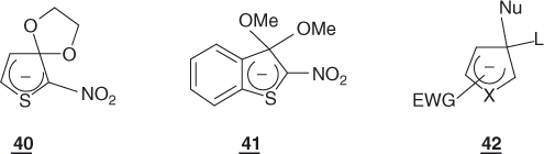 Although the susceptibility to nucleophilic attack is weaker at the β- than at the α-position to the heteroatom, identification of the stable σ-adducts 40 and 41 supports the idea that hetarenide intermediates of type 42 may form in nucleophilic substitutions of activated five-membered ring heterocycles bearing a leaving group in the 3-position. Table 1.3 compares the reactivity of 2-nitro-3-bromothiophene with that of its 3-nitro-2-bromo and 5-nitro-2-bromo isomers toward benzenethiolate in methanol.