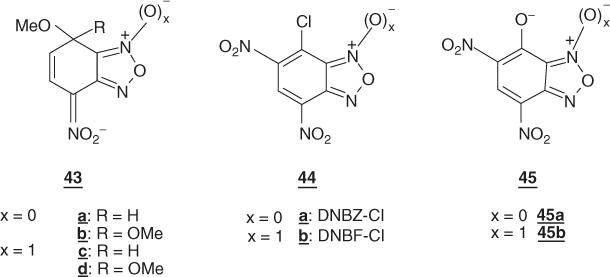 Obviously, it could be anticipated that addition of a second nitro group to NBD-Cl will project the resulting substrate, namely, 4,6-dinitro-7-chlorobenzofurazan (DNBZ-Cl; 44a) in a domain of SNAr reactivity inaccessible with aromatic or heteroaromatic structures so far considered. This expectation is fully materialized when DNBZ-Cl and the related 4,6-dinitro-7-chlorobenzofuroxan (DNBF-Cl; 44b) are allowed to react with a variety of weak or very weak nucleophiles. Thus, Table 1.4 shows that both DNBZ-Cl and DNBF-Cl hydrolyze very rapidly on reaction with water in aqueous acid solutions to afford the resulting “phenols” 45a,b: