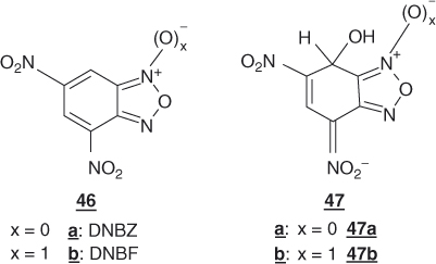 = 6.10 × 10−4 s−1, respectively [125]. Such a reaction is negligible with mononitrobenzofurazan and mononitrobenzofuroxan analogs and almost so with 1-chloro-2,4,6-trinitrobenzene [125]. Of great significance is that the strong increase observed in SNAr reactivity goes along with an enormous increase in the stability of related σ-adducts. The hydroxy σ-adducts 47a and 47b of 4,6-dinitrobenzofurazan (DNBZ, 46a) and 4,6-dinitrobenzofuroxan (DNBF, 46b) are 1010 times thermodynamically more stable than the hydroxy adduct of TNB [127].
