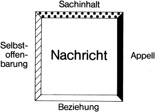 All diese Probleme im Kopf und eine ferne Erinnerung daran, dass Karl Bühler «drei Aspekte der Sprache» (1934) unterschieden hatte (Symbol, Symptom, Appell), kam ich schließlich auf den Gedanken, den Teilnehmern unserer Trainingskurse die «Nachricht» als quadratisches Gebilde darzustellen, wobei ich die Sichtweisen von Watzlawick und Bühler kombinierte: