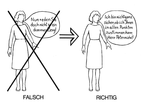 Verbesserung der zwischenmenschlichen Kommunikation durch Psychologie? Kommunikationspsychologie erhebt nicht nur den Anspruch, die Vorgänge zwischen Sender und Empfänger wissenschaftlich zu erhellen, sondern auch Rüstzeug und Wegweiser für eine Verbesserung der zwischenmenschlichen Kommunikation bereitzustellen. Wann aber ist eine Kommunikation besser oder schlechter? Als wir vor zehn Jahren mit unseren Trainingskursen begannen, waren wir – ohne uns das deutlich bewusst zu machen – der Auffassung, dass gute Kommunikation eine Sache der «ansprechenden Verpackung» sei. So hielten wir es für ungünstig, wenn jemand zu einem anderen sagte: «Nun reden Sie doch nicht so ein dummes Zeug!» Wir hielten es für günstiger, wenn er stattdessen etwa sagen würde: «Ich bin nicht ganz sicher, ob ich Ihnen in allen Punkten zustimmen kann» (s. Abb. 2).