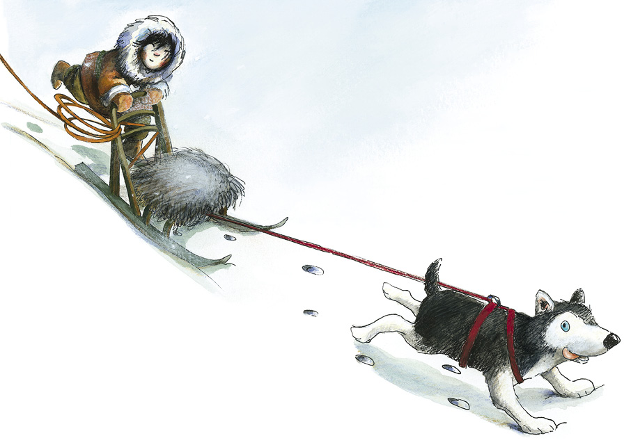 Draußen vor dem Iglu wartete schon sein braver Hund, den spannte er vor seinen Schlitten, und sie sausten los. Oder nein: Erst wartete der kleine Eskimo noch kurz, damit seine Mama das mit dem Eisbär und den Eisschollen aus dem Fenster rufen konnte und dabei nicht so laut schreien musste.