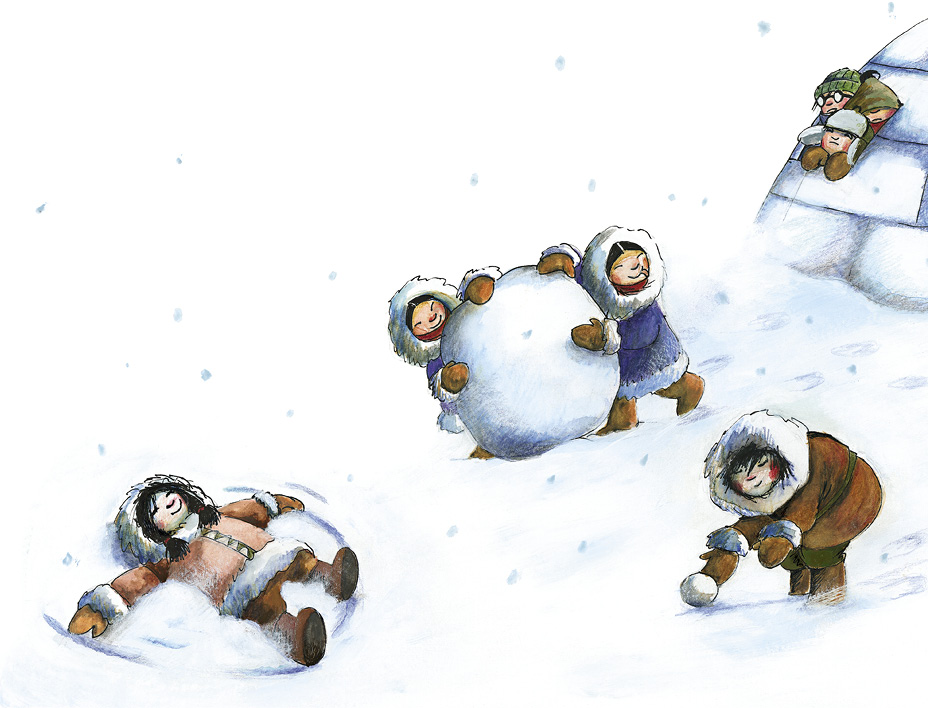 Weit, weit im Norden, wo die Welt ganz weiß ist vor lauter Eis und Schnee, da wohnte der kleine Eskimo. Morgens ging er in die Eskimoschule und passte schön auf, und nach dem Mittagessen machte er fleißig seine Hausaufgaben. Aber dann zog er seine warme Hose, seine warmen Stiefel und seinen warmen Anorak an und ging raus, spielen!
