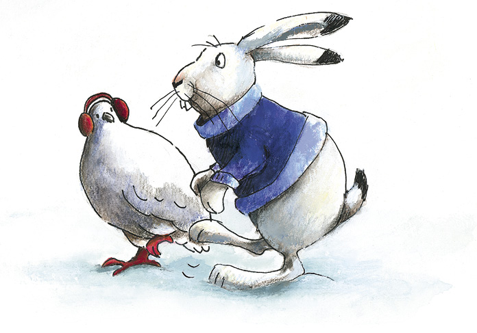 „Au! Pass doch auf, wo du hintrommelst!“, schimpfte auch das Schneehuhn, weil ihm der Hase immer auf die kalten Füße trat.