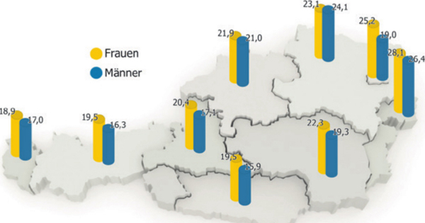 Abb. 1: Prozentuelle Verteilung von Bluthochdruck bei Männern und Frauen, verteilt auf die neun Bundesländer in Österreich