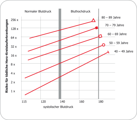 Das Risiko für die Entwicklung einer Herz-Kreislauf-Erkrankung beginnt bereits bei Blutdruckwerten ab 110 bis 115 mmHg systolisch bzw. ab 70 bis 75 mmHg diastolisch zu steigen. Für jede Steigerung des Blutdrucks um zusätzliche 20 mmHg kann mit einer Verdoppelung des Risikos für die Entwicklung einer schwerwiegenden Herz-Kreislauf-Erkrankung gerechnet werden. Das gilt für alle Altersgruppen (siehe Abb. 5).