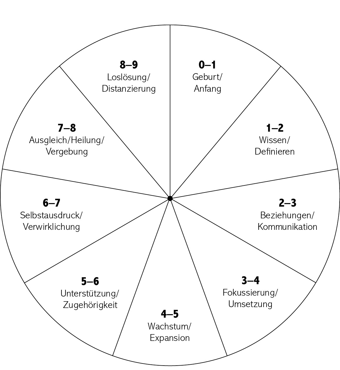 In einem 1er- oder 2er-Jahr befinden wir uns in der Anfangsphase eines Zyklus: Das ist die Entstehungsphase. In einem 8er- oder 9er-Jahr sind wir am Ende eines Kreislaufs angelangt. Das ist die Phase der Loslösung. Zwischen Jahr 3 und Jahr 7 befinden wir uns in der Mitte des Zyklus. Das ist die Aktivitätsphase.