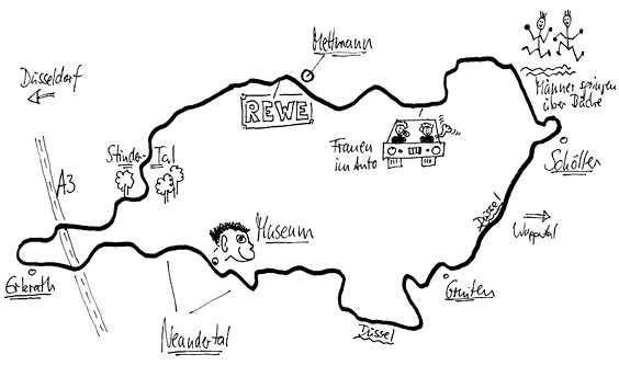 Oberhalb des Düsseltals weitet sich unser Blick, wir können bis ins Rheintal schauen. In diesem Gelände konnte man natürlich viel besser als in einem engen Tal jagen, das Wild viel früher erkennen. Zumal man sich die Ebenen der Steinzeit nicht nur frei von Häusern und Besiedlung, sondern auch weitgehend baumfrei vorstellen muss, eher wie die sibirische Tundra. Und es war ordentlich kalt. In der aktuellen Forschung wird davon ausgegangen, dass es in den europäischen »Sommermonaten im Durchschnitt selten wärmer als elf Grad Celsius wurde. Die Jahresmittelwerte zwischen minus vier und minus neun Grad entsprachen denen, die heute in der Arktis herrschen.« Man muss sich das einmal vorstellen, unter welch widrigen Bedingungen der Neandertaler gelebt hat. Vor 40000 Jahren, das muss man sich klarmachen, reichte das »ewige« Eis der Arktis bis an eine gedachte Linie der heutigen Städte Hamburg, Berlin und Warschau heran. Die Gegend um Mettmann war also klimatisch dem heutigen nördlichen Skandinavien vergleichbar, es war die nördlichste Region, in der menschliches Leben überhaupt vorstellbar war.