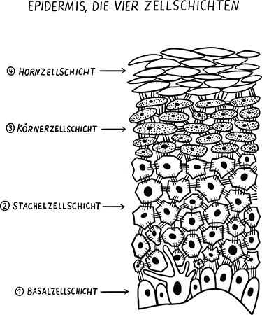 Sehen wir uns den Aufbau der Epidermis noch etwas genauer an. Sie besteht aus vier verschiedenen Zellschichten: einer »Babyzellschicht« (Basalzellschicht), einer »Pubertäts- und Heranwachsendenschicht« (Stachelzellschicht), einer »Erwachsenenzellschicht« (Körnerzellschicht) und schließlich einer Schicht toter Zellen (Hornzellschicht). Alle Zellen der Epidermis beginnen ihr Leben als Babyzellen. Aus ihnen entwickeln sich innerhalb von vier Wochen alle anderen Zelltypen bis hin zur eigentlichen Barriereschicht ganz oben. Die Epidermiszellen wandern auf ihrem Lebensweg also von innen nach außen.