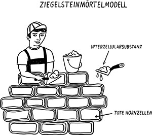 Unter dem Mikroskop erkennt man dann aber, dass diese Zellen wie kleine Ziegelsteine aussehen. Sie sind zwar mini, aber sehr robust, da sie aus hartem Keratin (also Horn) bestehen. Eingebettet sind diese kleinen, stabilen, toten Hornzellen in eine mörtelartige Substanz. Die hält nicht nur die Ziegelsteine gut zusammen, sondern sorgt auch dafür, dass keine Fremdkörper durch mögliche Lücken eindringen können. Dementsprechend nennen wir Dermatologen dieses mauerartige Gebilde auch das Ziegelsteinmörtelmodell.