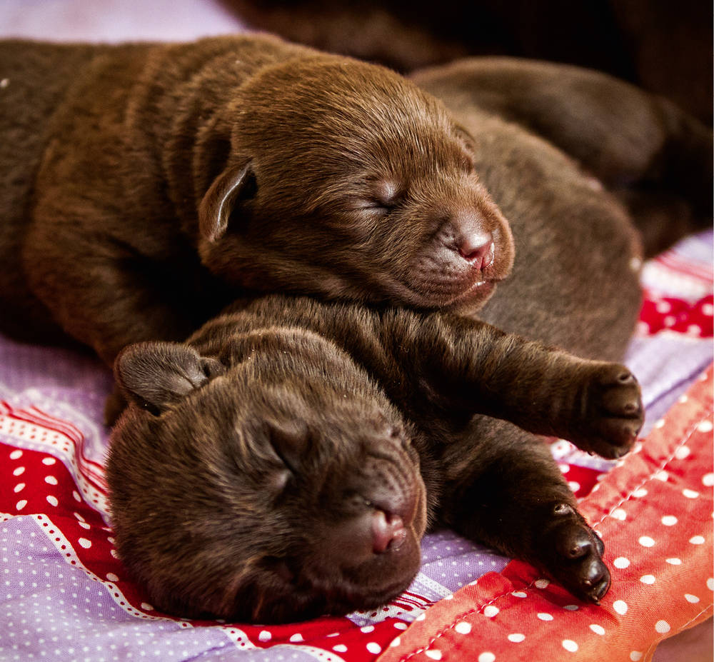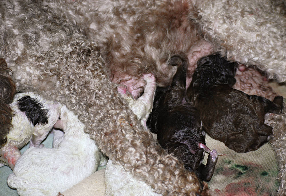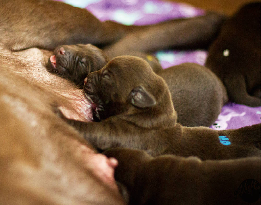 Die kleinen Welpen machen sich schon bald auf die Suche nach der mütterlichen Milchquelle und werden dafür mit der wertvollen Kolostralmilch belohnt, die besonders viele mütterliche Antikörper enthält. Schon dieses Suchen und die anschließende Belohnung durch den Erfolg sind sehr wichtige Erfahrungen, die man den Kleinen nicht nehmen sollte, indem man sie z.B. direkt vor die Zitze legt. In der Natur ist alles so eingerichtet, dass die Hundebabys von Anfang an nach ihren Fähigkeiten gefordert und gefördert werden, um eine optimale Entwicklung zu gewährleisten.