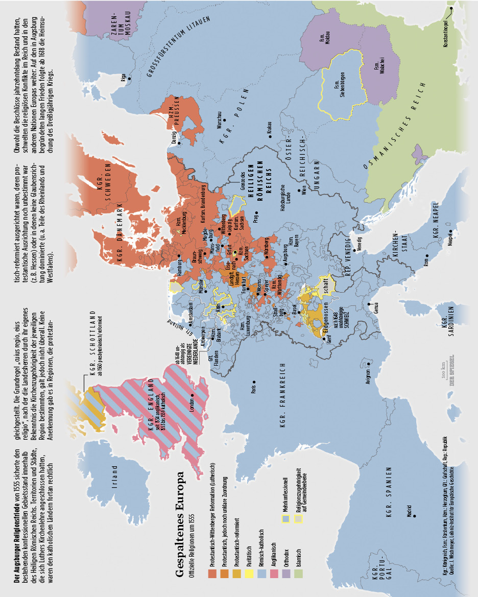 Weil die nach Unabhängigkeit strebenden Territorialfürsten ihre Interessen mit der Religionsfrage verbanden, stand über Jahrzehnte hinweg die Einheit des Heiligen Römischen Reiches auf dem Spiel. Auch die Idee eines universellen Kaisertums, die Karl V. als mächtigster Gegner der Reformation noch zu verteidigen suchte, war fortan überholt. Und nicht zuletzt begann die Kultur im Lande sich entlang der neu entstehenden Konfessionen zu formieren, bildeten sich unterschiedliche Lebens-, Denk- und Bildungstraditionen heraus, die sich sogar noch im 20. Jahrhundert oft antagonistisch gegenüberstanden.