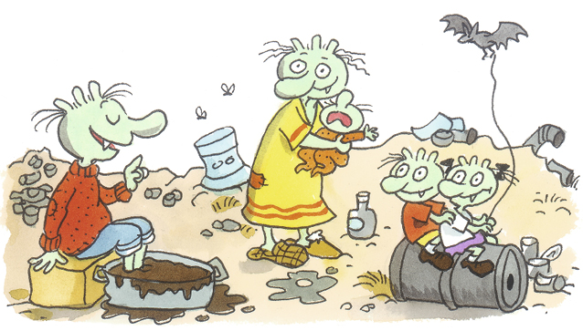 Olchis freuen sich, wenn sie im Müll leckere Sachen finden. Sie essen und trinken am liebsten Scharfes, Bitteres und Ätzendes.