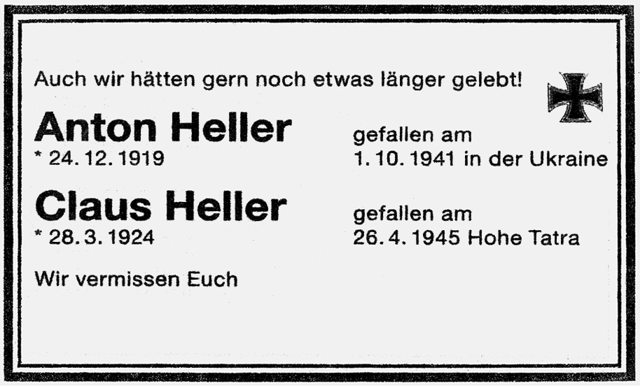 Die Anzeige erschien am 24.12.2012. War wohl als Geburtstagsgruß gedacht für den am 24.12.1919 geborenen Anton Heller.