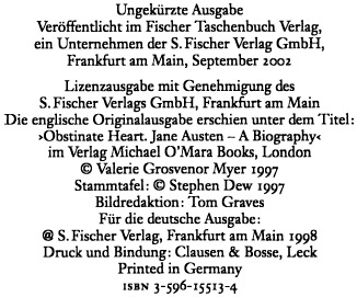 Für großzügige Hilfe und Unterstützung danke ich Tom Carpenter, Keith Crook, Rodney Dale, Sylvia Greybourne, David Keane, Gina Keane, Jascha Kessler, Susan McCartan, Derek McCulloch, Ken May, Brian Sibley, Ken Turner, David Weeks and Margaret Wilson. Yvonne Holland hat mir als Lektorin mit Einfallsreichtum und Feingefühl einen unschätzbaren Dienst erwiesen. Für sein präzises Korrekturlesen, seine innige Kenntnis der Welt Jane Austens und seinen Beistand bin ich meinem Mann, Michael Grosvenor Myer, dankbar.