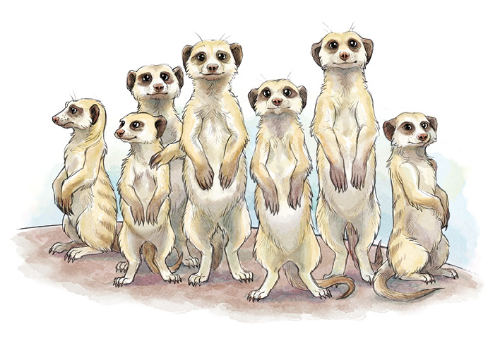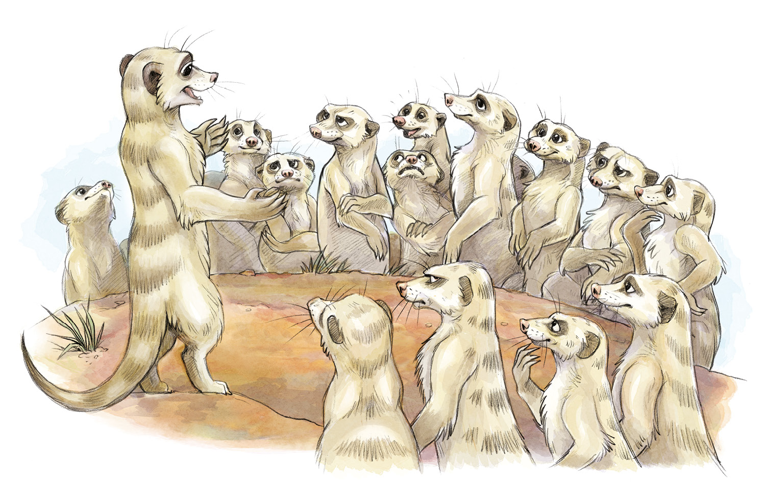 Es war einmal ein Clan von Tieren, die von uns Menschen als Erdmännchen bezeichnet wurden. Diese Tiere lebten in der Kalahari, einem trockenen Landstrich im Süden Afrikas. Das Stück Land, das sie als ihr Zuhause bezeichneten, sah auf den ersten Blick genauso aus wie viele andere Gegenden. Aber dank einer Mischung aus Pfiffigkeit, harter Arbeit und ein wenig Glück hatten ihre Vorfahren einen Ort geschaffen, der nicht so war wie alle anderen. Vor ihrer Ankunft dort hatte ein Buschfeuer den Boden gerodet und ihnen einen fast perfekten Lebensraum hinterlassen. Viele Raubtiere waren durch das Feuer vertrieben worden, und es gab reichlich Nahrung, die hauptsächlich aus Skorpionen, knusprigen Insekten, Würmern, Eiern und gelegentlich auch aus Früchten bestand.