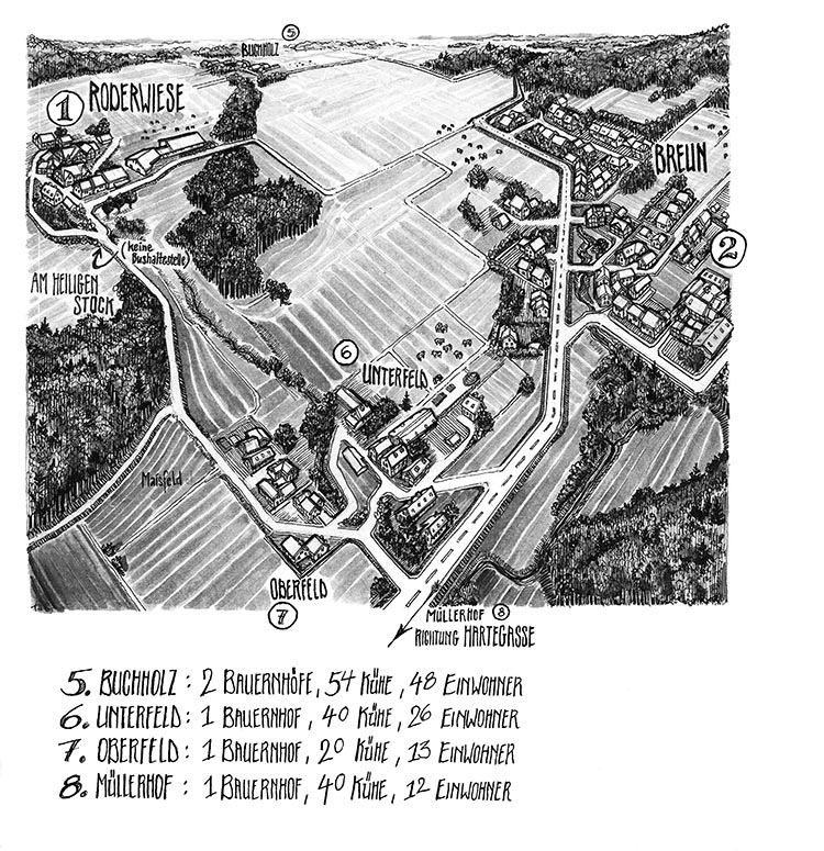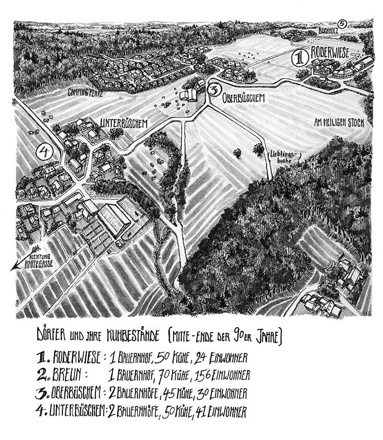 In meinem alten Heimatdorf gab es zur Zeit meiner Kindheit, also in den 90er Jahren, exakt sechs Häuser. Gut, wenn man die Ställe und Scheunen mitzählt, waren es zehn. Damit entsprach das Haus-Stall-Scheunen-Verhältnis ungefähr dem Schnitt in der Gemeinde Lindlar aus dem Jahr 1830: 582 Privathäuser, 487 Ställe und Scheunen. Natürlich hat sich dieses Verhältnis in Lindlar bis heute maßgeblich zugunsten der Privathäuser geändert. In Roderwiese nicht. Wobei in jüngerer Vergangenheit immerhin zwei «echte» Häuser dazukamen. Dafür ist aber auch einer der beiden Kuhställe extrem vergrößert worden. Wenn man ihn vertikal aufstellen würde, könnte er als Wolkenkratzer durchgehen. Das wäre allerdings schlecht für die Kühe.