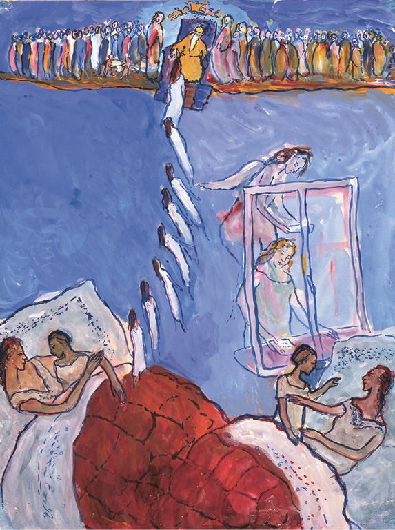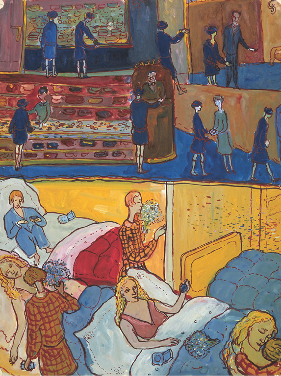 Charlotte malt die Hochzeitsnacht des jungen Paares als Theaterstück in drei Akten, mit dem feinen Hotel als Bühnenraum. (4166) Im ersten Bild reduziert sie das Hotel auf eine mit roten Plüschläufern ausgelegte Treppe, unten flankiert von einem livrierten Diener im Halbprofil. Albert und Franziska steigen die Treppe hinauf, aber nur ihre am Rumpf abgeschnittenen Beine bewegen sich aufwärts, die Oberkörper fehlen. Im Zimmer angekommen, stehen sie im zweiten Bild nah nebeneinander, Albert umfasst die Taille seiner Angetrauten, beide halten sich an den Händen, eher furchtsam als zärtlich. Die Zimmertür ist geöffnet, als böte sie eine Fluchtmöglichkeit. Auch hier köpft Charlotte das junge Paar, schneidet es an den Schultern ab. Ganz verloren wirken die Körper inmitten der in Himmelblau getauchten Belle-Époque-Pracht einer Hochzeitssuite: Empire-Sesselchen, geschwungene Kommode mit Kerzenleuchter, opulentes Bettgestell, über dessen Kopfteil ein holzgeschnitzter Engelkopf mit Flügeln wacht. Die Bettdecke schimmert weiß und seiden.