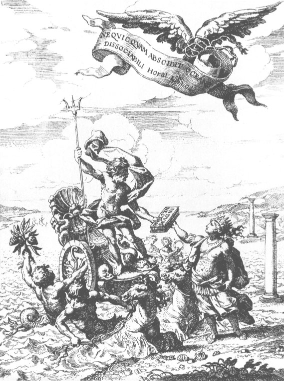 Neptun, Gott des Meeres, nimmt von einem personifizierten Amerika Schokolade entgegen; dieses allegorische Frontispiz zu Kardinal Brancaccios Abhandlung über die Schokolade aus dem Jahr 1664 illustriert ihren Transfer von der Neuen Welt nach Europa.