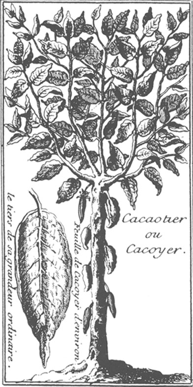 Etwas schematische Darstellung eines Kakaobaums (graviert) aus dem frühen 18. Jahrhundert, aus einem Reisebericht des Dominikaner-Priesters Jean-Baptiste Labat.