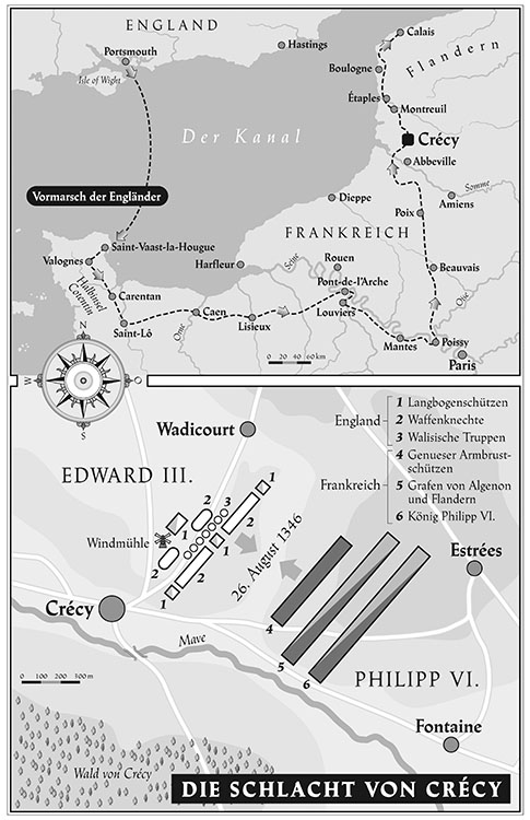 An den ledernen Gürteln der Bogenschützen hingen ihre Pfeilsäcke aus gewachstem Leinen, das die Pfeile vor Feuchtigkeit schützte – ein Pfeil mit nassen Federn flog nicht mehr gerade. Der Sack war mit Weidenruten versteift, damit die Befiederung aus Gänsefedern keinen Schaden nahm. Außerdem trug jeder Bogenschütze ein Kurzschwert, wie man es im nächsten Ort für sechs Pence bekam – das billigste Schwert, das es zu kaufen gab. Abgesehen davon waren ein langer Dolch und der Bogen, der sicher in seiner Lederhülle steckte, ihre einzigen Waffen. Ein kleiner Beutel enthielt eine Ersatzsehne aus Hanf, die zum Schutz vor Feuchtigkeit mit Bienenwachs behandelt war, sowie dünnen Faden, um beschädigte Befiederungen zu reparieren, einen ledernen Fingerschutz für die rechte Hand, damit die Sehne nicht einschnitt, und einen Armschutz für den linken Arm. Wie alle Bogenschützen entspannten die Brüder ihre Bogen für den Transport, um das Holz zu schonen. Jeder Mann trug auch einen kleinen Proviantbeutel bei sich. Sie waren die beweglichsten, am leichtesten bewaffneten Krieger auf dem Schlachtfeld, und mit sechs Pence am Tag bekamen sie doppelt so viel Sold wie die unberittenen Bogenschützen.