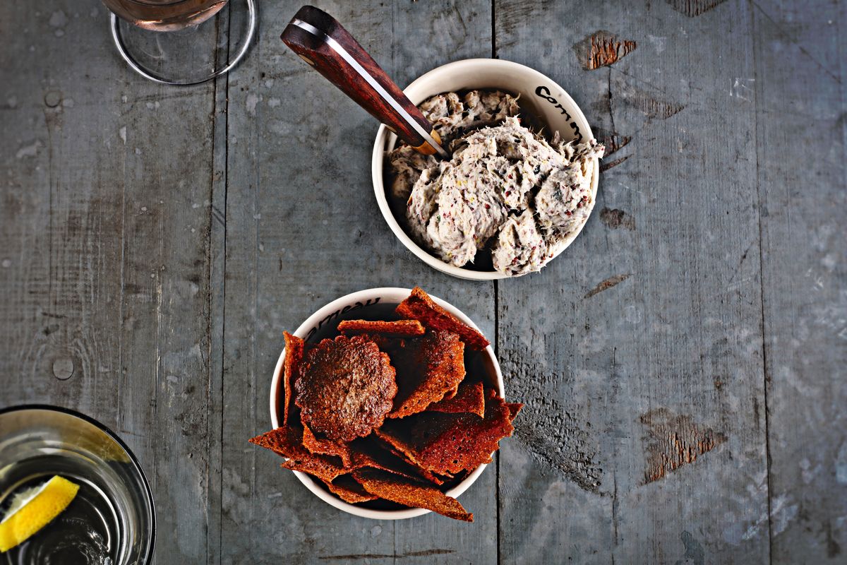 Die Rillette mit Buchweizenchips oder auf getoasteten Baguettescheiben anrichten.