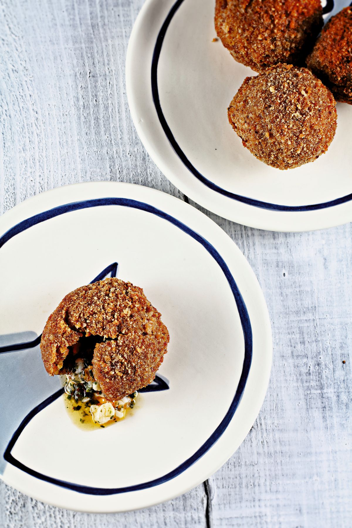 Die Bällchen nacheinander zunächst durch das Eigelb ziehen, sodass es die Bällchen komplett benetzt, anschließend durch das Paniermehl rollen. Die Bällchen erneut 10 Minuten in den Kühlschrank stellen.