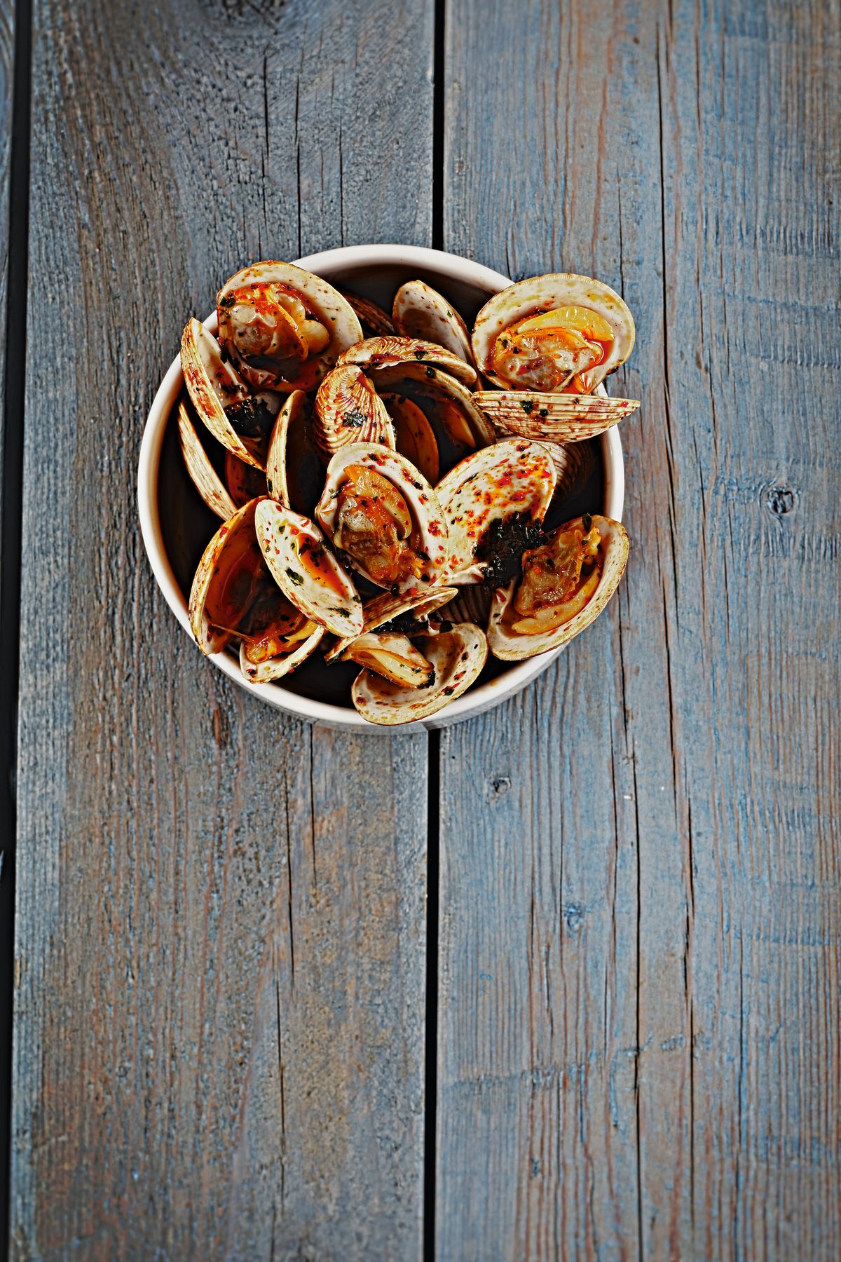 Geöffnete Venusmuscheln, die sich nicht schließen, wenn man dagegenklopft, und solche mit beschädigten Schalen aussortieren. Die Muscheln 30 Minuten in kaltem Salzwasser wässern, waschen und in einem Sieb abtropfen lassen.