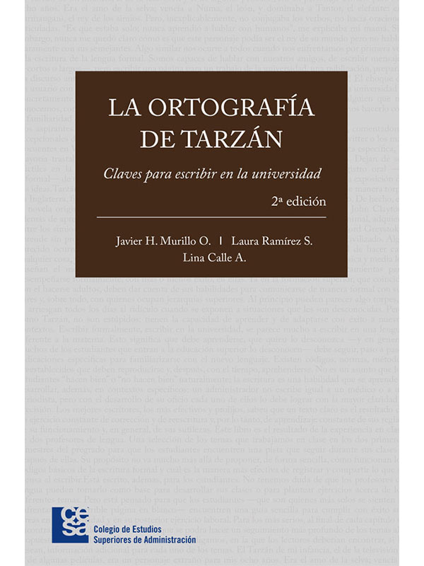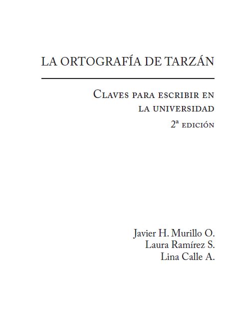 La ortografía de Tarzán: Claves para escribir en la universidad, 2a edición / Javier H. Murillo O. Laura Ramírez S.; Lina Calle Arango. Colombia, Editorial CESA 2016. 292p.