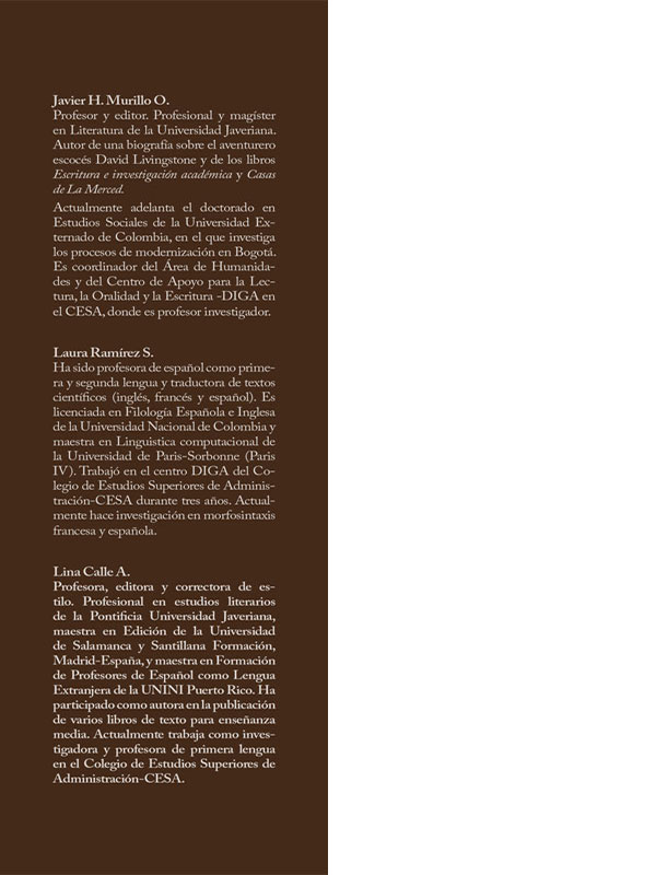 Como resulta natural, barrimos —en su sentido literal— aquellos errores involuntarios que cometimos en el proceso de escritura de la primera edición (siempre hay algo más, siempre queda algún otro…) y aprovechamos el desorden para revisar la diagramación y la forma de ofrecer el material a los lectores. Creemos —los autores de la primera edición y Lina Calle, la nueva jugadora del equipo— que con estas variaciones mejoramos una idea que ha resultado exitosa; que hacemos más asequible su contenido y nos ocupamos de los principales temas que resultan relevantes a la hora de escribir textos en la universidad.