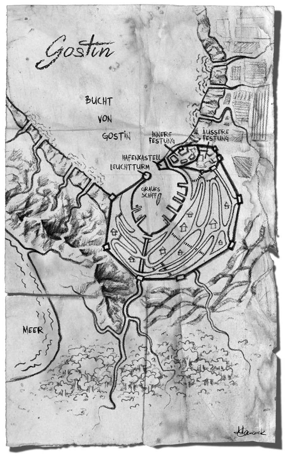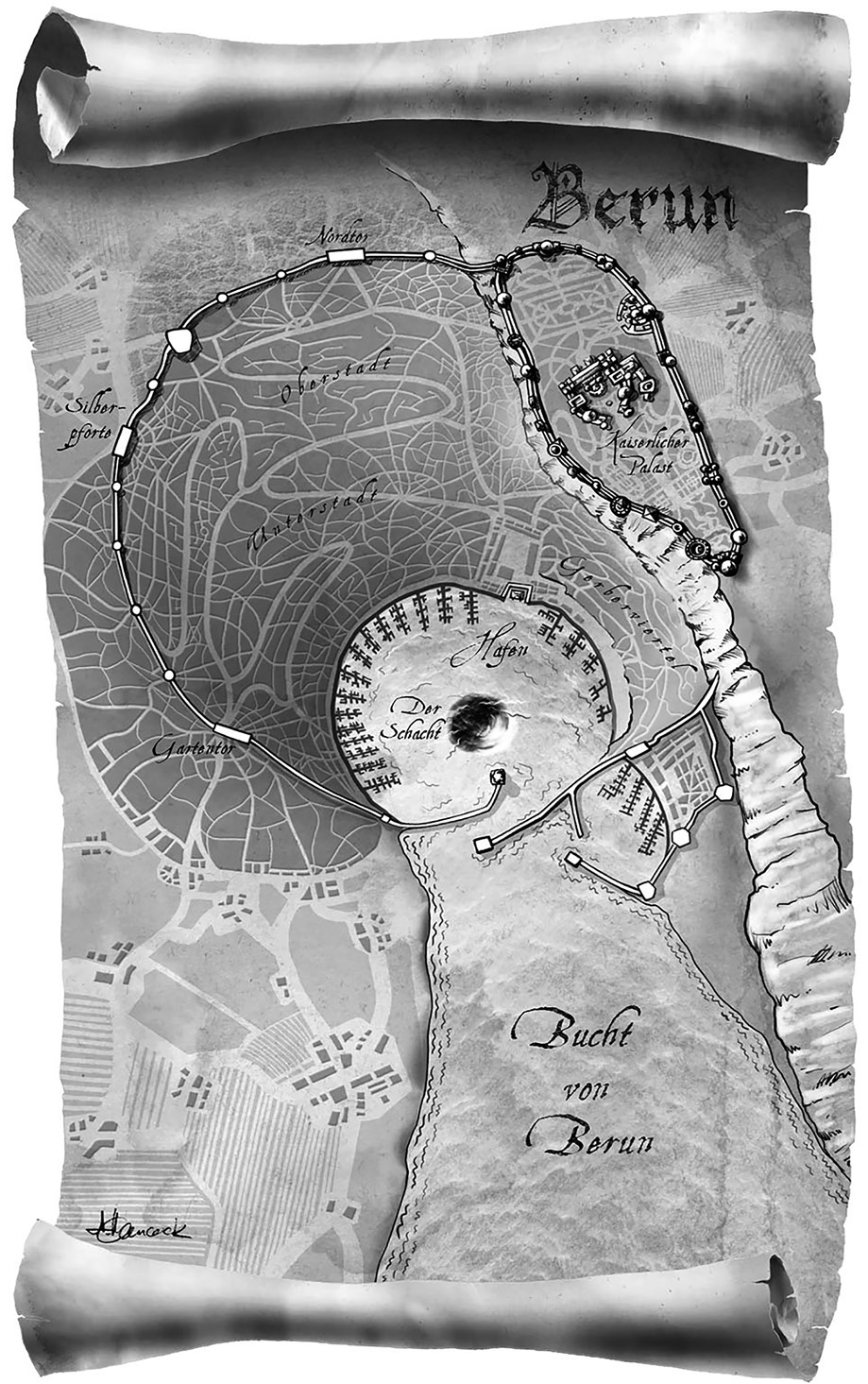 Die größte Stadt des Macouban lag auf einer kaum eine halbe Meile breiten Landenge, die die flache Bucht des südlichen Meeres vom Gunboru, dem größten Strom des Landes, schied. Nicht nur diese strategisch günstige Lage sprach für die Stadt, sondern auch die Tatsache, dass hier die einzigen Felsen im Umkreis von beinahe zwei Tagesmärschen zu finden waren. Ein Großteil davon war in vergangenen Jahrhunderten dafür aufgewendet worden, eine zwei Schritt hohe Mauer zu errichten. An mindestens zwei Stellen in der Nähe des Tors war das von Moos und Flechten bewachsene Bauwerk inzwischen mit Holz ausgebessert worden. Doch nach allem, was Cunrat wusste, hatte die Mauer ohnehin seit Generationen nicht mehr dazu gedient, menschliche Angreifer abzuwehren, sondern war nur dazu da, die gefährlicheren Flussbewohner davon abzuhalten, nachts in die Stadt zu kriechen. Und diesen Zweck erfüllte sie vermutlich auch mit nachlässigen Flicken. Hinter der Mauerkrone ragten spitze Dächer auf, die mit Schindeln des dunklen einheimischen Holzes gedeckt waren. Sie glänzten feucht im Dunst, der nach dem Regen des Morgens faseriger Watte gleich zwischen den Gebäuden und in den nahen Baumkronen hing.