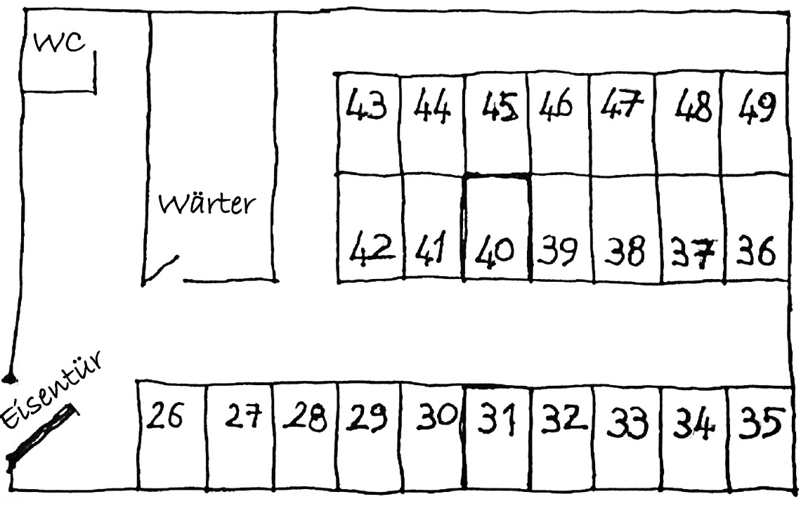 Die Zelle von einem Meter Breite und zweien Länge war uns zunächst winzig vorgekommen, mittlerweile hatten wir uns eingewöhnt. Boden und Wände waren aus Beton, die Tür aus grauem Eisen. Einrichtungsgegenstände gab es keine. Wir hockten auf dem nackten Boden; schliefen uns die Beine ein, standen wir auf und drehten Runden. Manchmal, wenn wir den Kopf hoben, bei einem Schrei aus der Ferne, blickten wir einander im schummrigen, vom Gang hereinfallenden Licht an. Die Zeit verging mit Schlafen und Reden. Wir froren erbärmlich und wurden jeden Tag dünner.