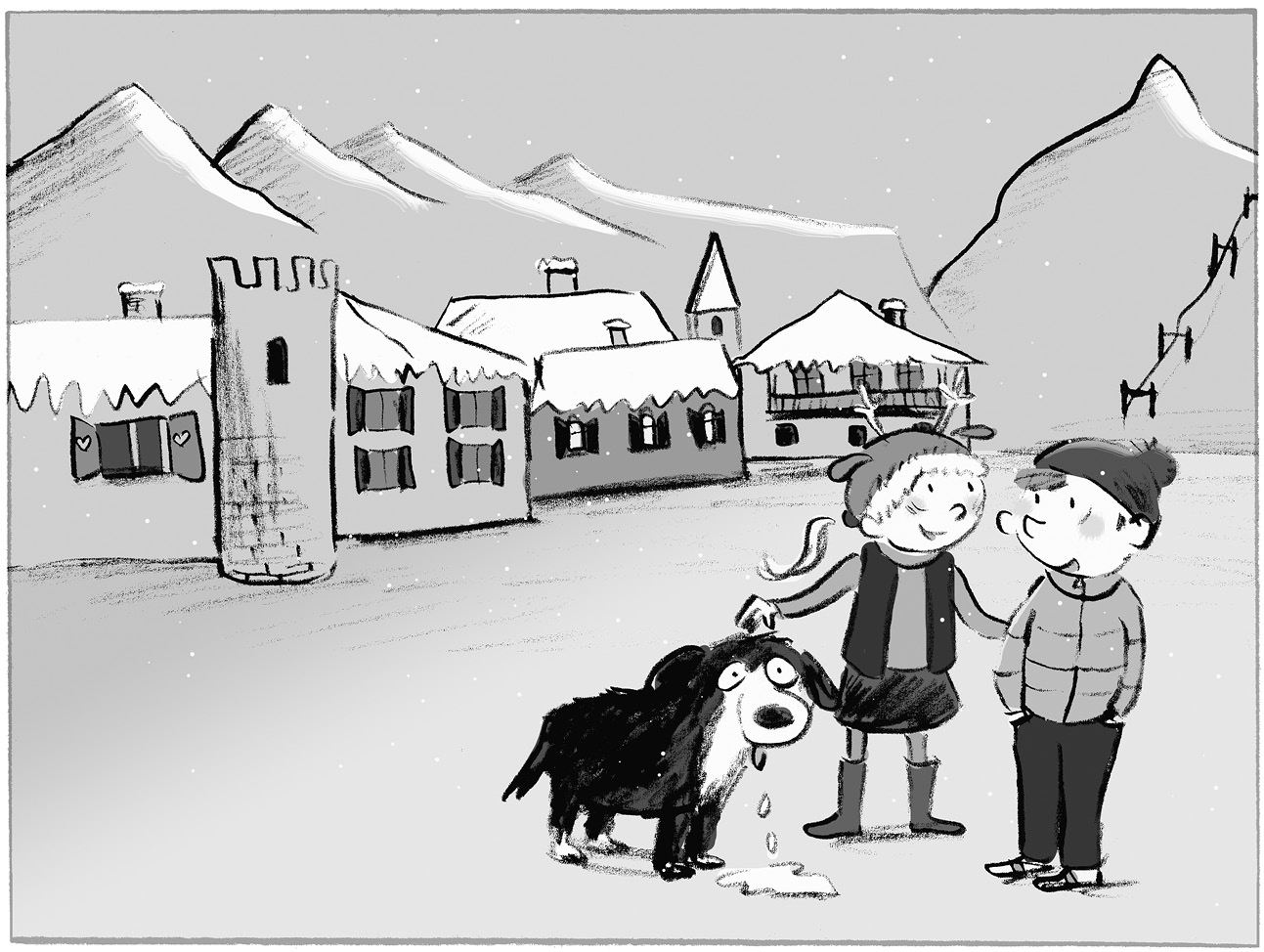 Draußen schneit es, und wir sind kaum zur Tür raus, als Caruso auch schon anfängt, Schnee zu fressen. Ich habe irgendwie den dummen Verdacht, dass er denkt, das weiße Zeug müsste weg. Jetzt hat er wahrscheinlich vor, so lange Schnee zu verschlingen, bis der Hügel vor unserem Hotel wieder schön grün ist.