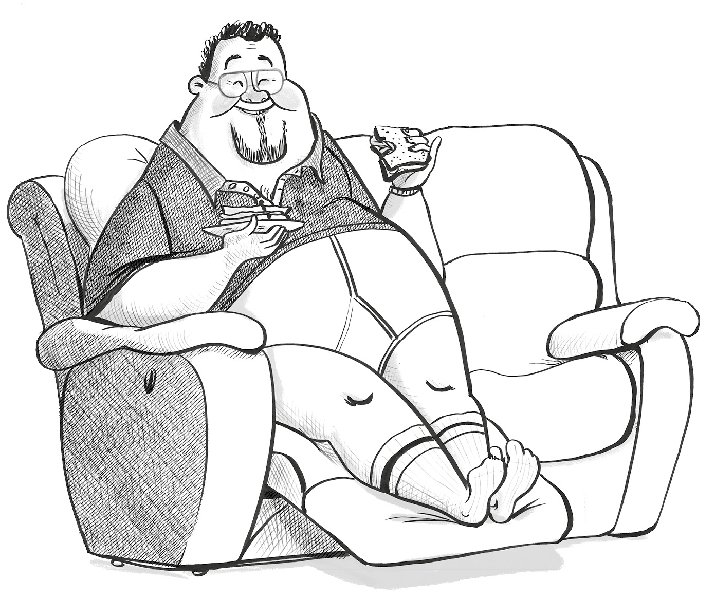 Der Fairness halber muss gesagt werden, dass Eric – normalerweise nach mehrmaliger Aufforderung durch seine Frau Janine und seine Kinder Fred und Ellie – schon eine Menge Diäten hinter sich hatte. Die Ballaststoff-Diät, die Eiweiß-Diät, die Saft-Diät, die Püree-Diät, die Kohlsuppen-Diät, die Erbsensuppe-mit-frischer-Minze-Diät und die Bananenmuffins-und-Käse-Diät, die er sich selbst ausgedacht hatte. Er hatte die 5:2-Diät, die 6:1-Diät, die 4:3-Diät, die 2:5-Diät und sogar die 17:28-Diät hinter sich (bei der täglich in der Zeit zwischen 17 Uhr 27 und 17 Uhr 29 gefastet wurde). Er war bei Weight Watchers, den Anonymen Schokaholikern, den Gürtel-enger-Schnallern und den Kräftig-vollschlanken-Schinkenbrot-Einlagerern-die-im-Kreis-sitzen-und-behaupten-ihr-Übergewicht-sei-nicht-ihre-Schuld gewesen (und so nannte Janine ehrlich gesagt all seine Selbsthilfegruppen).