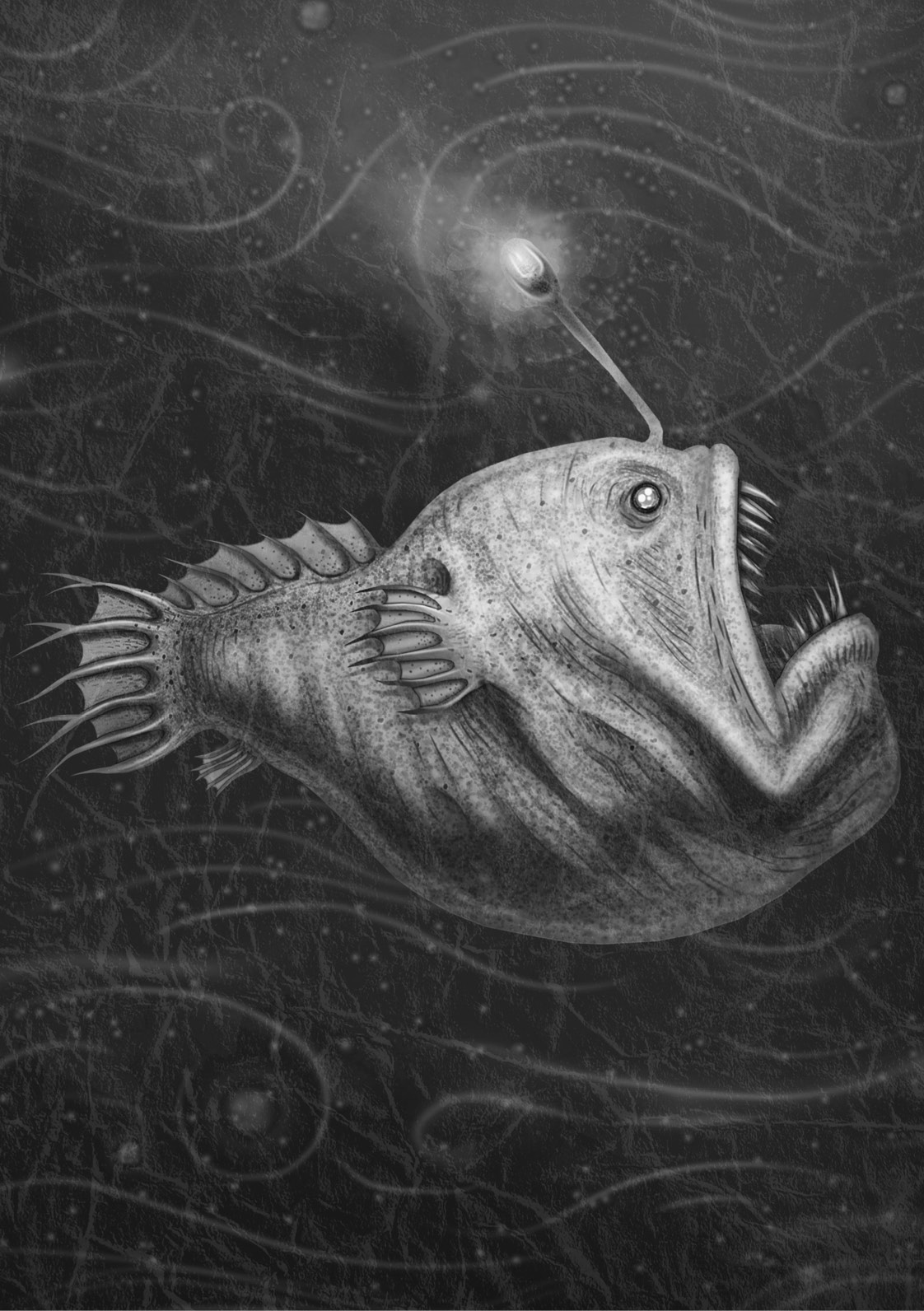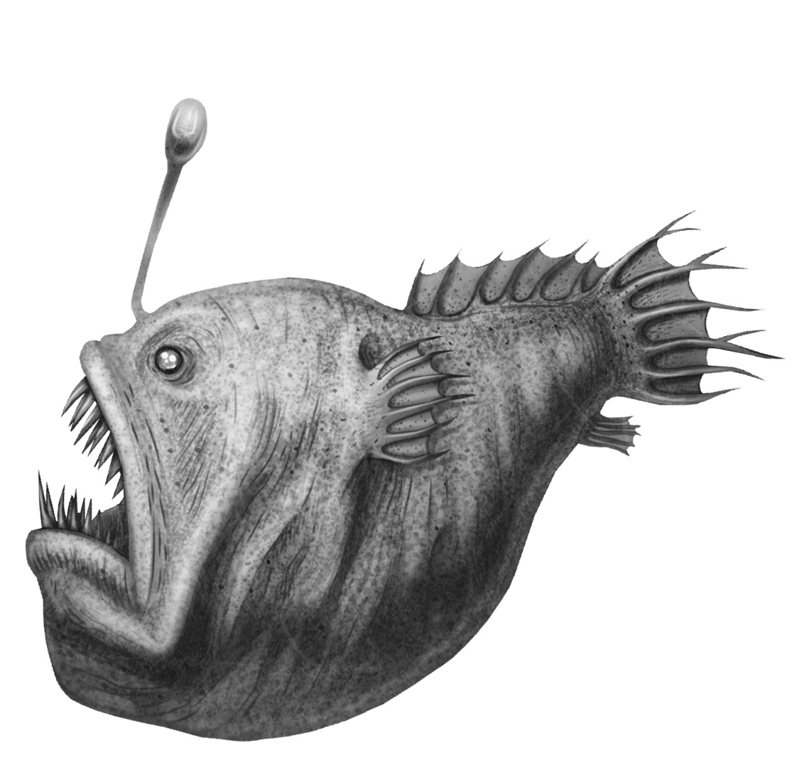 Es wäre in der Tat verzeihlich anzunehmen, dass die Weibchen und Männchen der gut 160 Tiefseeanglerarten zu unterschiedlichen Spezies gehörten. Die Weibchen sehen spektakulär aus: Zuallererst einmal verfügen sie über eine biolumineszente Beuteattrappe, ein Leuchtorgan, das vor ihrem Gesicht baumelt und sowohl Beute als auch Männchen der eigenen Spezies anlockt. Die verschiedenen Arten weisen unterschiedlich geformte Leuchtorgane auf, die jeweils anders blinken, sodass die Männchen auf Partnersuche fremden Arten aus dem Weg gehen können. In ihren gewaltigen Kiefern sitzen riesige Fangzähne, mit deren Hilfe sie ihre in der einsamen Meerestiefe rare Beute verschlingen, und die Mahlzeiten werden in höhlenartigen Mägen verdaut. Tatsächlich variieren Tiefseeanglerarten enorm in Form und Größe. Einige sind eher stromlinienförmig gebaut, während andere wie ulkig bauchige Kugeln mit Gesichtern wirken, die statt auf Tempo und Manövrierbarkeit auf ein Leben als schwimmender Softball setzen.