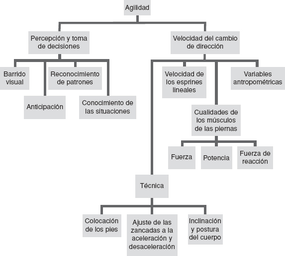 L a mayoría de los deportes de equipo, como el baloncesto, el fútbol y el fútbol americano, se caracterizan por movimientos rápidos de aceleración, desaceleración y cambios de dirección en un tramo de 9 metros.45 Por otra parte, deportes de pista como el tenis y el voleibol también implican velocidad multidireccional y cambios de dirección en un tramo de 4 a 10 metros.40 De acuerdo con diversos entrenadores y expertos del deporte, toda tarea de agilidad implica un cambio de dirección rápido del cuerpo como respuesta a un estímulo.41, 53 La agilidad se puede dividir en cualidades físicas y capacidades cognitivas.53 Este capítulo examina las cualidades físicas de la velocidad, la fuerza, la potencia y la técnica, así como las cualidades de los músculos de las extremidades inferiores.