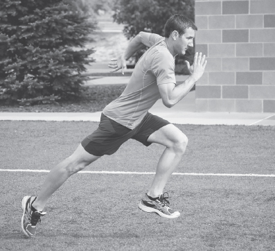 2. Al despegarlo del suelo durante la fase de propulsión, el pie toca el suelo en una posición preparada, con el tobillo flexionado hacia arriba, aproximadamente 90 grados (flexión dorsal), y con los dedos apuntando hacia atrás, hacia la espinilla. Una vez que el pie establece contacto con el suelo, el deportista extiende simultáneamente la cadera, la rodilla y el tobillo con toda la fuerza posible (véase la figura 1.1). Este movimiento se conoce como triple extensión.47