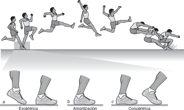 Para saltar en el aire, la mayoría de las personas flexionan con rapidez las caderas, las rodillas y los tobillos, y a continuación extienden dichas articulaciones. Ello sucede porque el estiramiento rápido de las estructuras musculotendinosas implicadas (mediante una acción excéntrica) genera más fuerza y potencia en menos tiempo durante la acción posterior (concéntrica) de acortamiento de las mismas estructuras.29, 49 Este proceso, conocido como ciclo de estiramiento-acortamiento, interviene en la mayoría de las actividades de la vida diaria. Implícitamente, todas las habilidades deportivas que requieren fuerza máxima y producción de potencia para un rendimiento correcto emplean este ciclo. Las tareas compuestas de ciclos secuenciales de estiramiento-acortamiento comprenden la aceleración para lanzar una pelota, la flexión del brazo antes de tirar de la pelota del brazo de un running back para que la deje caer, la flexión del cuerpo unos centímetros antes de levantarse de una sentadilla, caminar o cualquier otro movimiento que implique una rápida aceleración, desaceleración y cambios de dirección.