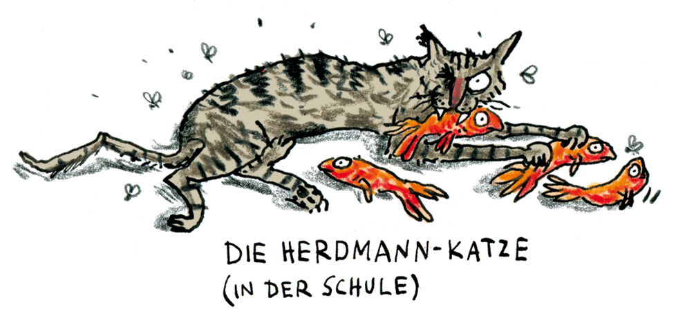 Einmal fegte Klaus Herdmann die ganze erste Klasse in drei Minuten leer, als er die Katze als Anschauungsmaterial in den Biologieunterricht mitbrachte. Er hatte sie zwei Tage lang nicht gefüttert, sodass sie besonders wild war. Dann brachte er sie in einem Karton mit in die Schule, und als er den Karton öffnete, schoss die Katze heraus – senkrecht in die Luft. Sie landete oben auf der Tafel und brachte ihr auf dem Weg nach unten vier tiefe, lange Schrammen bei. Dann raste sie wild durch die Gegend, kratzte die kleinen Kinder, hinterließ überall Katzenhaare und zerfetzte Bücher und Papier.