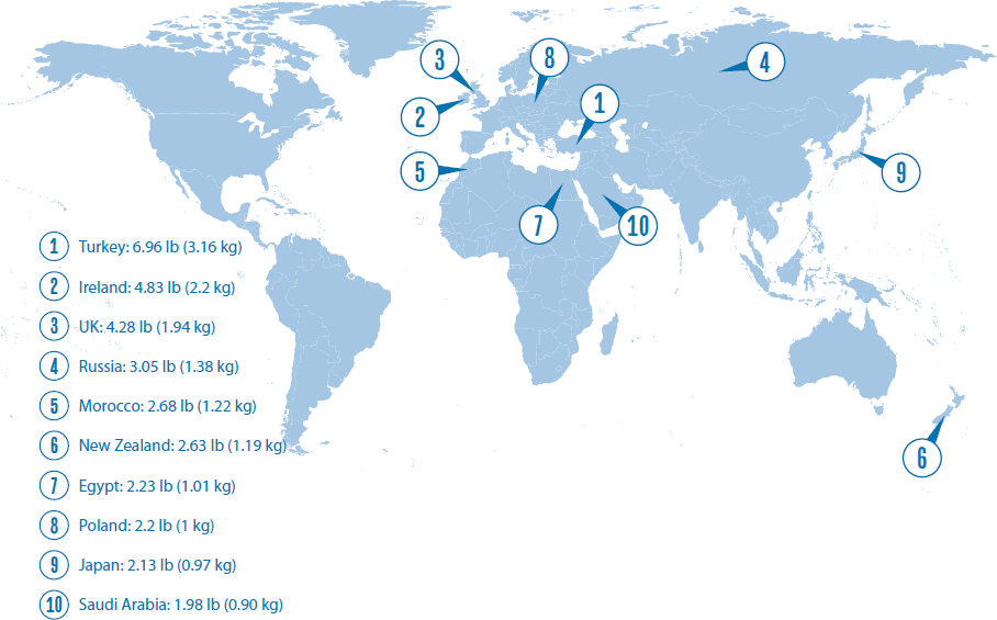 China is the largest consumer of tea, with 1.6 billion lb of it consumed a year, but a look at per-capita consumption globally paints a different picture: