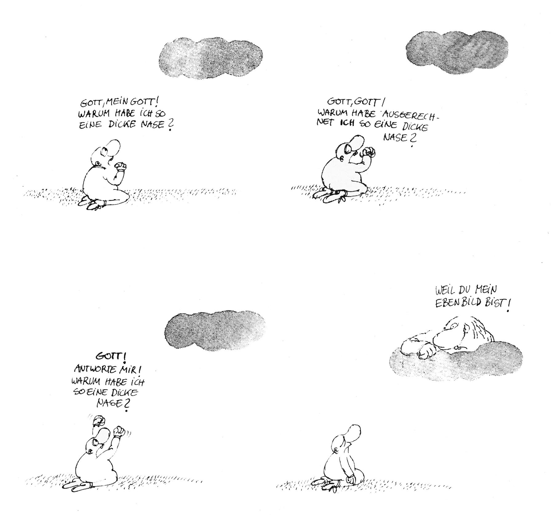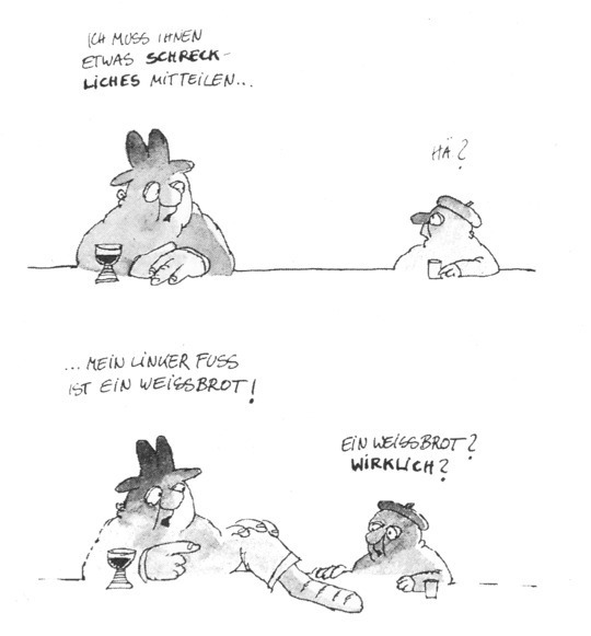 Anders als in Charles Baudelaires »Die Blumen des Bösen« reimt sich in Robert Gernhardts »Die Blusen des Böhmen« kein Wort aufs andere, und doch passt alles zusammen. Das 1977 erstmals erschienene Buch mit mehr als hundert Bildergeschichten und Fotoromanen, Karikaturen und Kurzgeschichten, Kriminalstories und Märchen durchmisst das weite Rund der Komik, die das Leben schreibt, und lässt kaum einene Sachverhalt ungeschoren, kaum etwas unberührt. Erzählt wird unter anderem vom lieben Gott, der über die Erde wandelt und einen richtig netten Abend beim reichen Mann verbringt, über Ehen im Sturm oder die »sensationelle Super-Sauerei«. Ob Fußball oder Wetterbericht, Pornogroßhandel oder Weihnachten, Erster Weltkrieg oder Belsazars Tod – kein Thema ist schrecklich genug, als dass ihm Robert Gernhardt nicht eine komische Seite abgewinnen könnte – meist eine schrecklich komische.