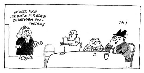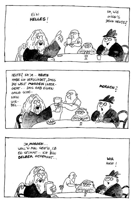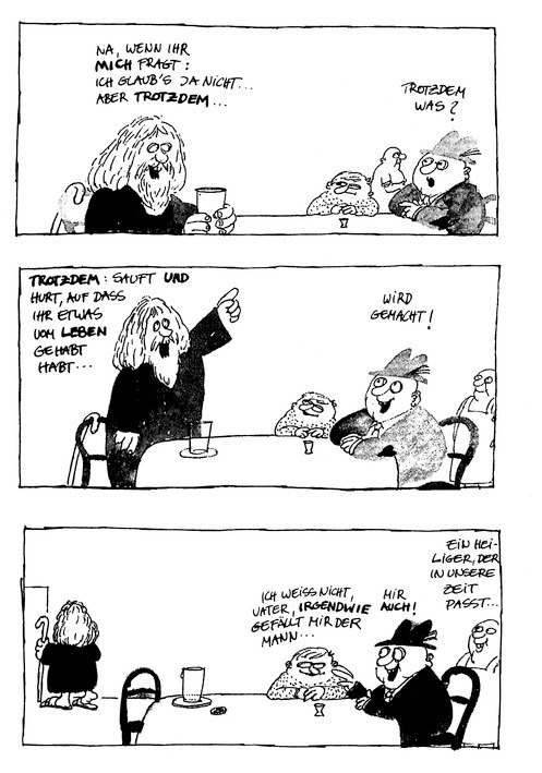 »Gut«, sagte der Dekan laut, »wir kennen nun Ihre Meinungen. Jetzt passen Sie mal auf.« Er griff in seine Tasche, holte eine Nadel heraus und steckte sie mit dem stumpfen Ende in eine Tischritze. Darauf faltete er seine Hände, und nach kurzer Zeit kamen einige Engel in den Raum geschwebt. Sie kreisten eine Weile über der Nadel, dann setzte sich erst einer darauf, nach einigem Zögern ein zweiter, schließlich ein dritter. Ein vierter Engel versuchte es, rutschte aus und fiel auf den Tisch. Er versuchte es ein zweites Mal, wieder mißlang es, die Nadel bot keinen weiteren Platz mehr. Die Engel blieben eine Weile, dann verließen sie lautlos die Aula.