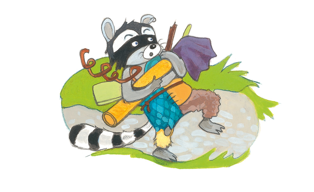 Dann klapperte und schepperte es. Hinter dem morschen Überrest einer dicken Eiche kam ein Waschbär hervor, der einen Haufen seltsames Zeug im Arm hatte. Das ließ er nun krachend vor sich auf den Boden fallen.