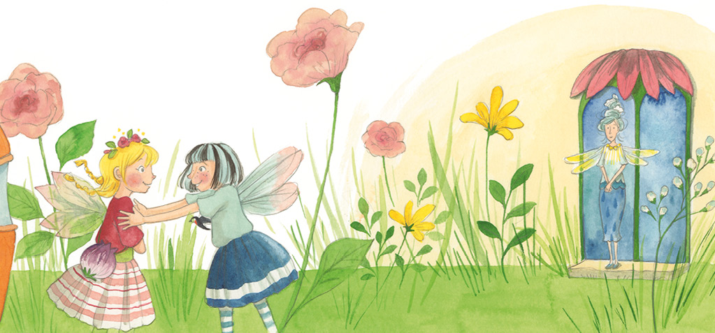 »Was meinst du? Wie soll es schon gewesen sein?« Rosalie wirbelte den von Feenkraut gesäumten Weg zur Schule entlang. Die riesigen Blütenstängel neben dem Eingang wiegten sich im lauen Abendwind, als wollten sie Rosalie begrüßen. In der Eingangstür stand eine lange, spindeldürre Fee mit lichtblauen Kleidern und himmelblauem Haar. Aus ihrer Turmfrisur hatten sich einige Strähnen gelockert, als hätte ein heftiger Sturm daran gezerrt. Eindeutig eine Wetterfee! Es war Frau Windhauch, die Schulleiterin.