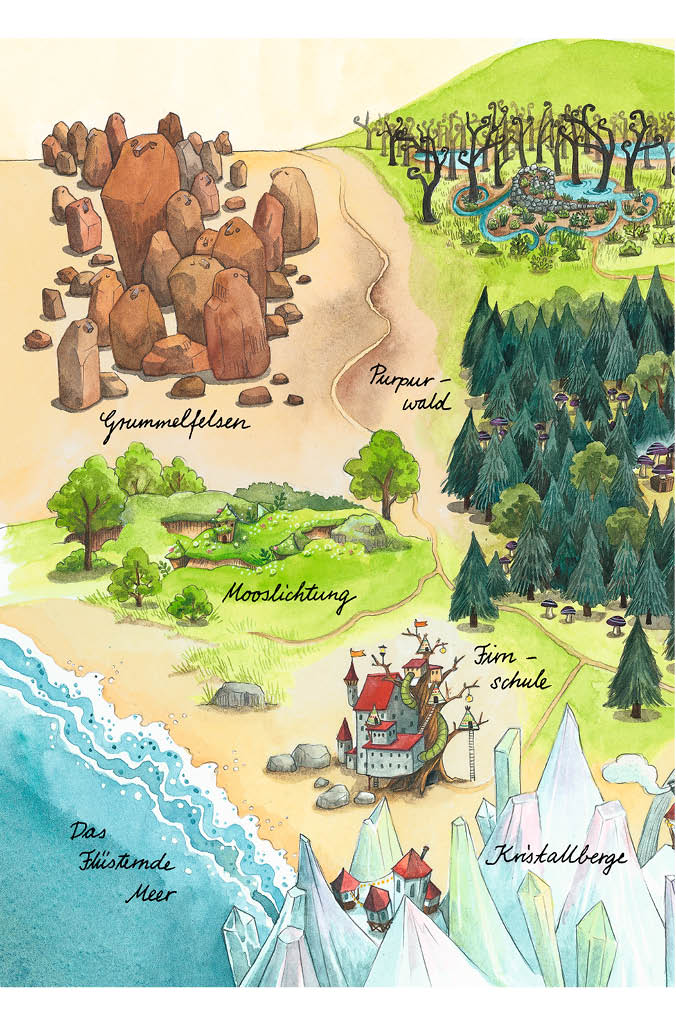 Mit ziemlicher Verspätung – Rosalie hatte ihre Reiseflügel nicht gefunden – fuhr die kleine Fee von einem Besuch bei ihren Eltern in die Schule zurück. Unter der Woche lebte Rosalie seit ihrem siebten Geburtstag im Internat Blütenwald, nur am Wochenende fuhr sie ab und zu nach Hause. Neugierig steckte die kleine Blumenfee den Kopf aus dem Fenster und beobachtete die vorbeiziehende Landschaft. Über saftig grüne Mooshügel knatterte die Kutsche, vorbei an prallen Brombeerbüschen und entlang eines murmelnden Baches. Rosalies Herz klopfte laut. Ach, wie sie die Mooslichtung, ihre Familie und ihren Freund Jokkel jetzt schon vermisste. Alles könnte so schön sein, wenn nicht …