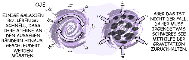 Anfangs versuchten die Astronomen, die Masse von Galaxien zu schätzen, indem sie zählten, wie viele Sterne sie enthielten. Doch als sie mithilfe dieser Zahl berechneten, wie schnell die Galaxien rotieren müssten, stießen sie auf Unstimmigkeiten. Messungen ergaben, dass sich die Galaxien schneller drehten, als die Zahl der in ihnen enthaltenen Sterne vorhersagte. Mit anderen Worten, die Sterne hätten eigentlich an den Rändern der Galaxien davonfliegen müssen wie die Tischtennisbälle vom Karussell. Um zu erklären, warum die Sterne trotz der hohen Rotationsgeschwindigkeit zusammenhielten, mussten die Astronomen eine gewaltige Masse zu den Galaxien hinzurechnen. Aber sie konnten nicht erkennen, wo diese Masse steckte. Dieser Widerspruch ließ sich lösen, wenn man annahm, dass sich in jeder Galaxie Riesenmengen eines schweren Stoffs befanden, der unsichtbar – oder »dunkel« – war.