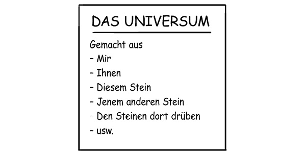 Diese Methode wirft aber erhebliche Probleme auf. Erstens: Ihre Liste wird sehr, sehr lang werden. Sie muss jeden Stein auf jedem Planeten im Universum einschließen, und sie muss auch Ihre Liste selbst enthalten (denn die ist ein Teil des Universums). Wenn Sie wollen, dass die Liste neben den Objekten auch die in ihnen befindlichen Dinge umfasst, könnte sie unendlich lang sein. Halten Sie es hingegen nicht für notwendig, dass die Liste auch die Teile innerhalb der Objekte erfasst, könnte Ihre Liste mit einem einzigen Element auskommen: »dem Universum«. Wie gesagt, diese Methode wirft große Probleme auf, egal wie Sie sie angehen.
