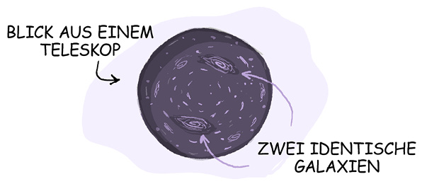 Eine Galaxie zweimal zu sehen, ist durchaus denkbar, wenn sich etwas Schweres (und Unsichtbares) zwischen Ihnen und dieser Galaxie befindet; dieser unsichtbare, schwere Klumpen kann wie eine Riesenlinse wirken und das Licht der Galaxie so ablenken, dass es aus zwei Richtungen zu kommen scheint.