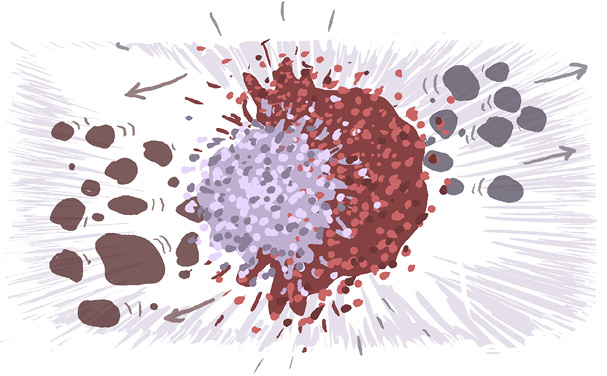 Den überzeugendsten Beweis für Dunkle Materie lieferte uns eine gigantische Galaxienkollision im All. Vor einigen Jahrmillionen krachten zwei Galaxienhaufen ineinander und verursachten ein Ereignis von wahrhaft kosmischen Ausmaßen; die Kollision selbst haben wir nicht erlebt, aber da das Licht vom Schauplatz des Geschehens Jahrmillionen braucht, um uns zu erreichen, können wir uns bequem zurücklehnen und in aller Ruhe die daraus resultierenden Explosionen beobachten.